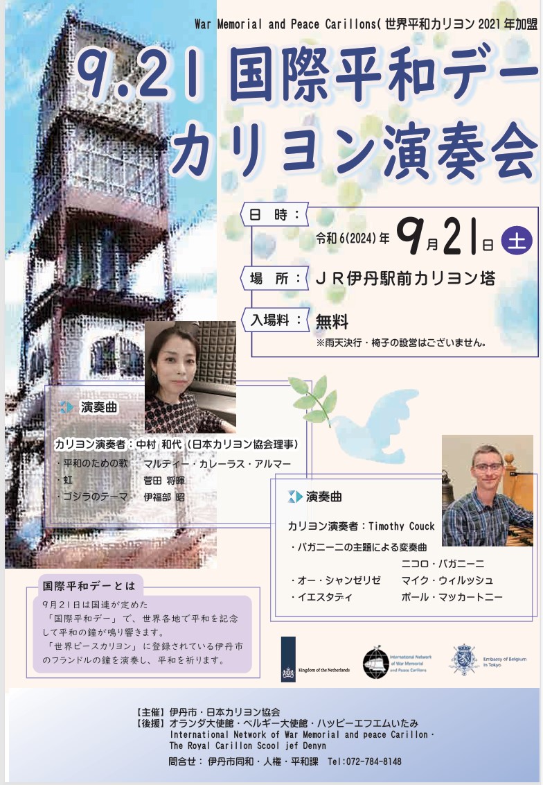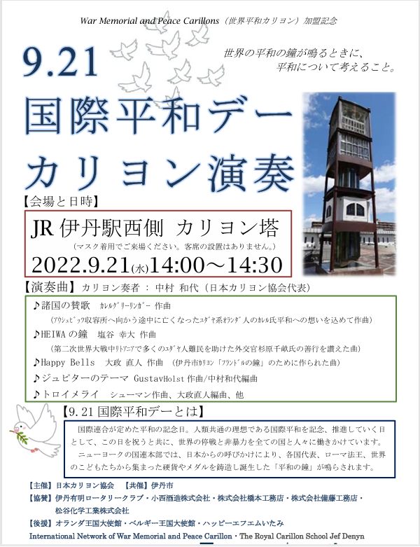 日本にあるカリヨンに関わるほぼ全ての団体(伊丹市43鐘、ハウステンボス37鐘、大阪市トラヴェリングカリヨン37鐘、神戸松蔭女学院11鐘、椙山女学院10鐘)、皆で平和を願って打鐘いたしました。その後、伊丹市で毎年9月21日にカリヨンコンサートを行っております。