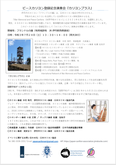 2021年6月、伊丹市フランドルの鐘がピースカリヨンに登録されました。この機を祝い、7月はピースカリヨン登録イベントとして、